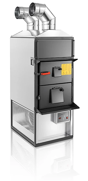 Számos fatüzelésű kazán közül mi a légbefúvásos változatot ajánljuk, mivel nagy előnye a vizes rendszerrel szemben a rendkívül gyors felfűtési idő. A kazán beindítása után néhány perc alatt kellemes hőérzetet biztosít a műhelyben/csarnokban.