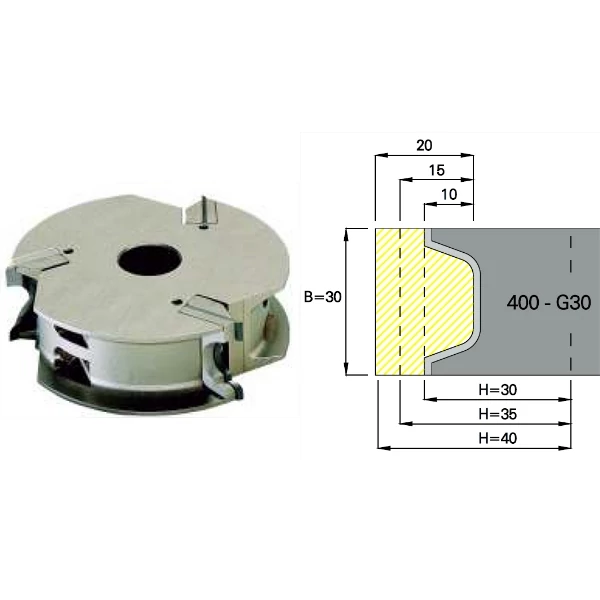 Az üres marófejbe a felhasználási igények szerint a szerszám méretét szem előtt tartva válasszon profilozott támasztólapkát (ART.401-P) és 2 vagy 3 mm-es profilozott betétkést (ART.402/403-P). A szerszám átmérője üresen 137 mm, lapkamérettől függően lapkával 140/150/160 mm.