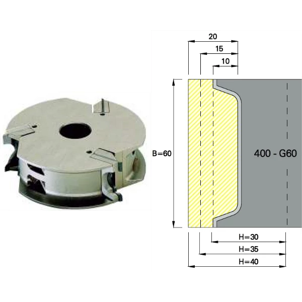 Az üres marófejbe a felhasználási igények szerint a szerszám méretét szem előtt tartva válasszon profilozott támasztólapkát (ART.401-P) és 2 vagy 3 mm-es profilozott betétkést (ART.402/403-P). A szerszám átmérője üresen 137 mm, lapkamérettől függően lapkával 140/150/160 mm.