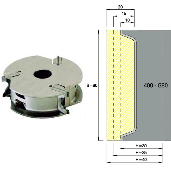 Az üres marófejbe a felhasználási igények szerint a szerszám méretét szem előtt tartva válasszon profilozott támasztólapkát (ART.401-P) és 2 vagy 3 mm-es profilozott betétkést (ART.402/403-P). A szerszám átmérője üresen 137 mm, lapkamérettől függően lapkával 140/150/160 mm.