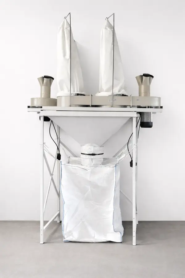 2 db külön indítású, 3,75kW-os motor, 2 db 4x100 mm átmérőjű elosztóidom, forgácsterelőidőm 1 db BIG-BAG zsákhoz (a zsák opció), 4 db felső szűrőzsák, masszív vázszerkezet keresztmerevítésekkel, aljzathoz rögzíthető talpak